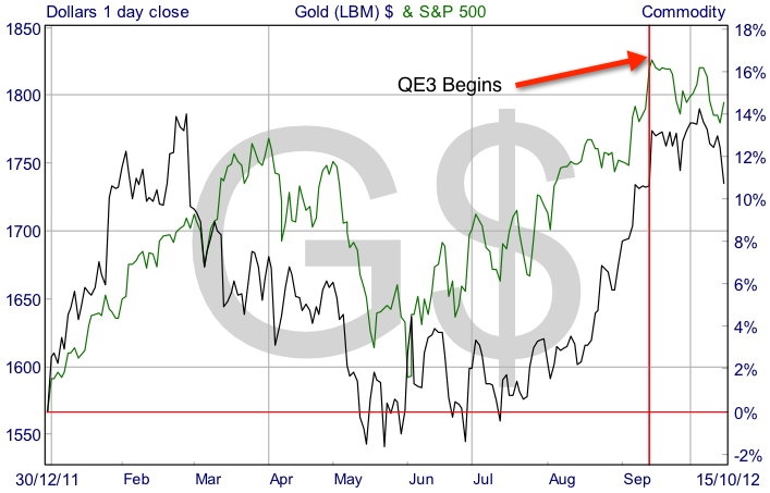 Although being up on the year, gold yesterday hit a one month low just below $1,730 and buying interest has been muted from actual physical gold buyers like the jewellery industry. Is QE3’s gold boosting power waning and is the price of the precious metal now likely to revert to trend?