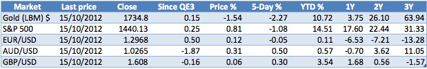 As we can see from the table above, so far the effects from the latest QE program have not delivered was what supposed to be in the script for gold and even the Aussie has produced a negative return, although this is linked specifically to the Australian Reserve Banks own interest rate cuts in an attempt to weaken the currency given the slowing export markers and softer commodity prices that has weighed on economic growth there.