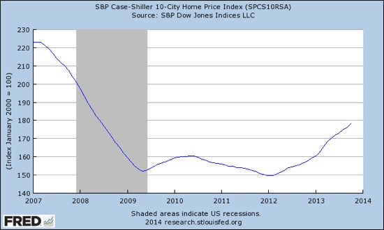 The S&P Case-Shiller records home prices for 10 American cities. As can be seen, and unlike what happened in the equity market, home prices have not recovered their prior peak. Recall that the majority of the populace’s wealth is tied up in their homes. Again, they have fallen behind relative to the rich. Whilst equity markets started their recovery in 2009, home prices continued to drop for almost an extra three years and the gains are still very mild.