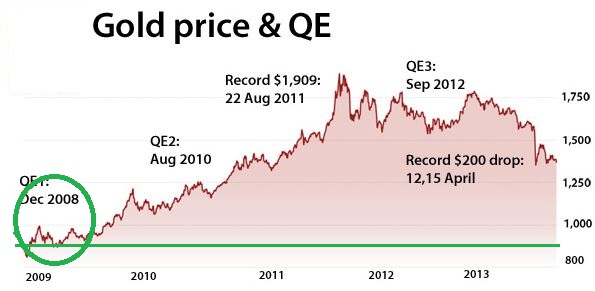 It is now an unarguable fact that QE has not increased the consumption of the population en bloc but that it has resulted in one of the greatest wealth redistributions ever. The richest are getting richer, and at the cost of the hard working middle class, the poor and also future generations. There will be real social fall out as an after effect of this in years to come and we leave you with one final re-iteration of the point made above – “It means that the price of the dollar relative to any other asset drops, and that is the same as saying that the purchasing power of the dollar declines”. The one asset that has increased at a much lower rate than other assets is the supposed “barbarous relic” gold as we can see from the chart below.